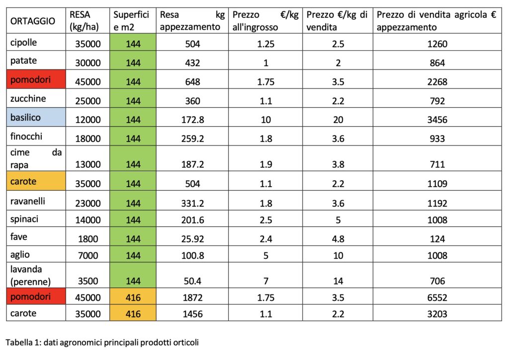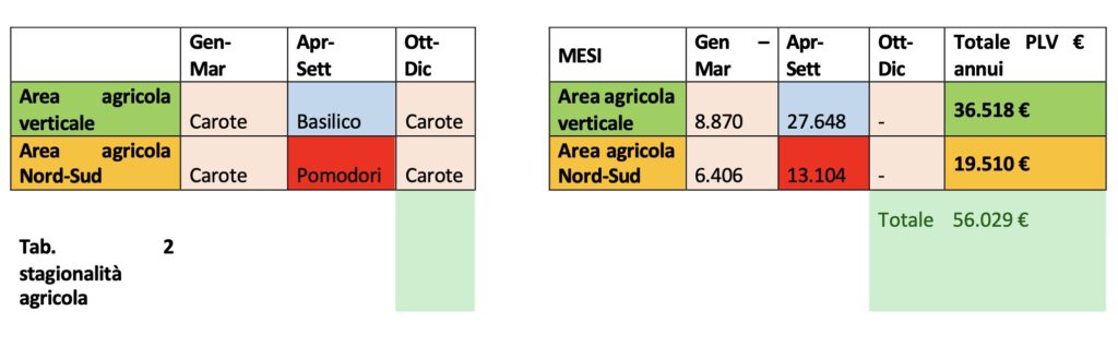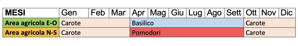 Ai fini di una valutazione economica della produzione agricola si è ipotizzato di coltivare in alternanza stagionale le carote Autunno-Inverno e pomodori nella primavera estate. Nella stagione estiva, verranno dedicate le aree EO alla coltivazione del basilico. Questa è, ovviamente, una scelta semplificata utile ad una prima analisi della sostenibilità del progetto.