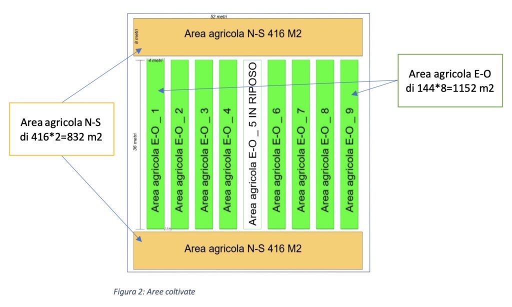 Ogni area risulta pertanto di una dimensione pari a 144 mq, per un totale di tutte le aree 8 di tipo a) coltivate contemporaneamente di 1.152 mq.